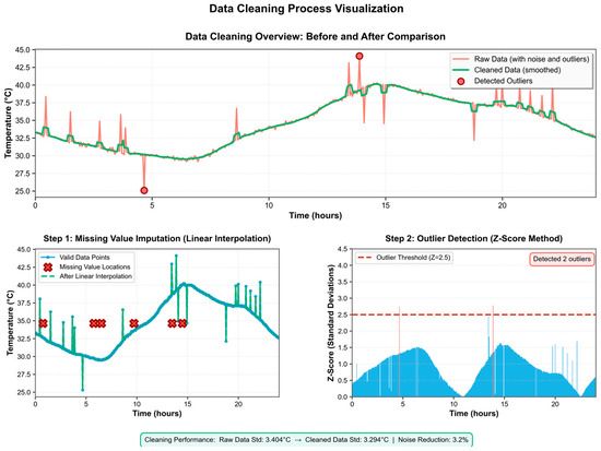 The dataset employed in this study was collected from outdoor distribution cabinets located in a specific district of Beijing, China, recording the dynamic variations in joint temperature during actual operation. Due to the complexity of the monitoring environment, the raw data inevitably contained missing points, outliers, and noise. If such data were fed directly into the prediction model without cleansing, the training process would likely become unstable, and the predictive accuracy could be degraded [24]. Therefore, prior to modeling, systematic data preprocessing was required to ensure the reliability and stability of the input data.
