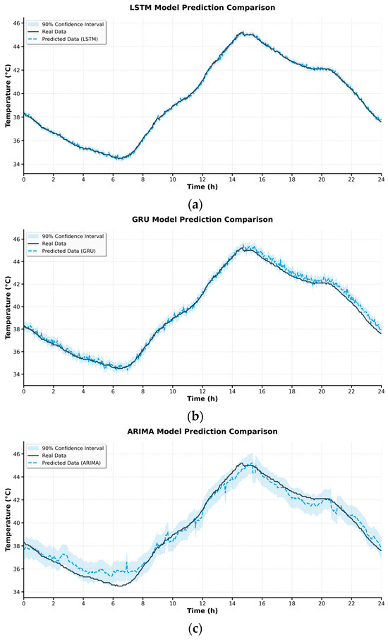 It can be observed that the LSTM curve outperformed the other models in both temporal alignment with temperature variations and amplitude accuracy, exhibiting smaller residuals in peak segments. The GRU model performed well in most steady-state intervals but showed a certain response lag in high-frequency fluctuation periods. The ARIMA model depicted the overall trend in a relatively smooth manner; however, its deviation increased significantly in non-stationary intervals, especially near sharp peaks. This is consistent with the known limitations of traditional linear modeling frameworks in handling complex nonlinear time-series data.