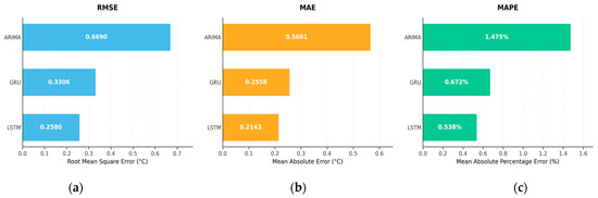 To quantitatively assess the aforementioned fitting differences, the root mean square error (RMSE), mean absolute error (MAE), and mean absolute percentage error (MAPE) were calculated, with the results shown in Figure 8. The ranking of these three metrics remained consistent across the models: the LSTM model achieved the lowest RMSE, MAE, and MAPE on the testing set, followed by the GRU, while the ARIMA yielded the highest values. Compared with the LSTM, the GRU showed only a limited performance drop, whereas the ARIMA exhibited a substantial increase in error for all metrics. These results indicate that deep networks incorporating long-term dependency modeling and nonlinear feature learning offer significant advantages in capturing complex temperature evolution patterns and mitigating prediction bias.