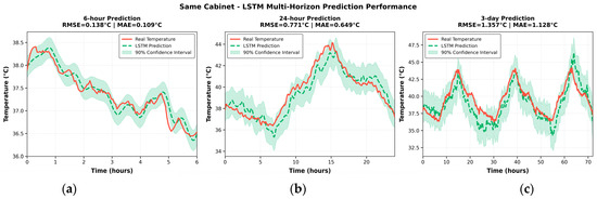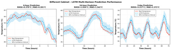 As shown in Figure 10, the 6 h forecast maintains good phase alignment and amplitude accuracy, comparable to the same-cabinet case. However, with an increasing forecast horizon (24 h and 3 days), the deviations become more evident: the peak amplitudes slightly decrease, response lags appear on rising edges, and uncertainty intervals widen.