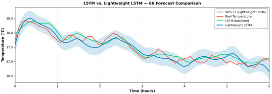 To visually demonstrate the impact of quantization on the model’s fitting capability, Figure 12 presents a comparison between the measured temperature profile, the original LSTM prediction, and the lightweight LSTM prediction over a 6 h task, with confidence bands plotted around the two predicted curves. Both models capture the overall temperature trend and short-term fluctuations with high consistency. The lightweight model exhibits slight amplitude deviations at several peaks and troughs, and its confidence band is marginally wider; nevertheless, it remains well aligned with the measured curve. These results indicate that mixed-precision quantization markedly enhances the feasibility of edge deployment without causing a substantial loss in the ability to fit key temporal features [26].