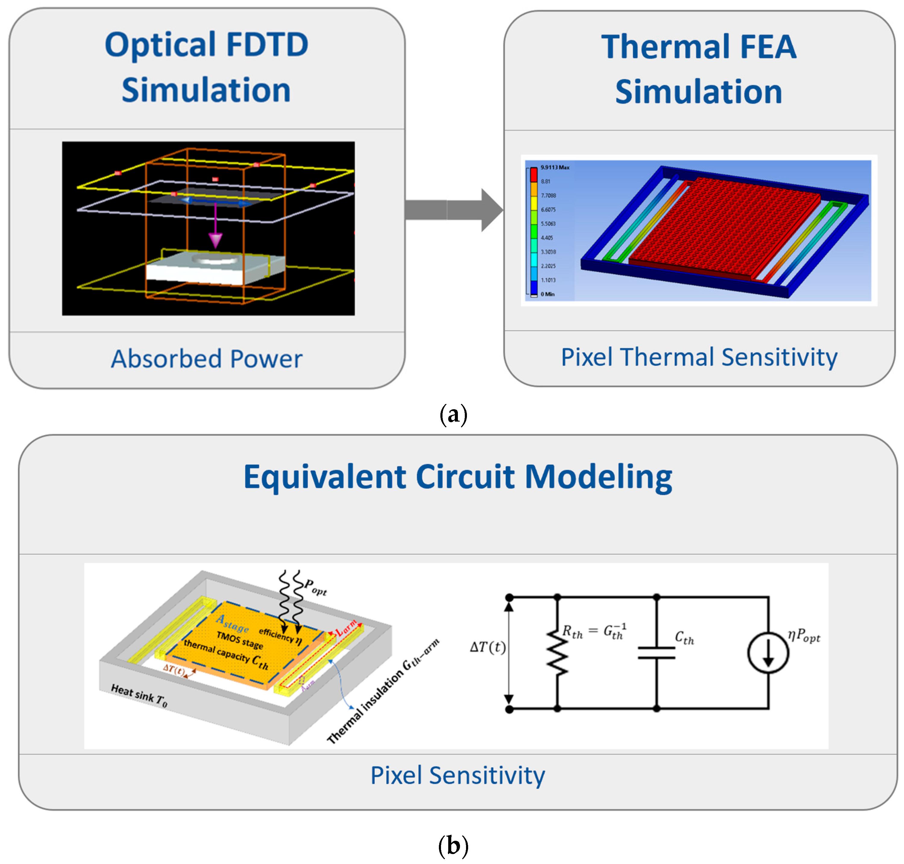 - Zviagintsev, A.; Blank, T.; Brouk, I.; Bloom, I.; Nemirovsky, Y. Modeling the Performance of Nano Machined CMOS Transistors for Uncooled IR Sensing. IEEE Trans. Electron. Devices 2017, 64, 4657–4663. [Google Scholar] [CrossRef]