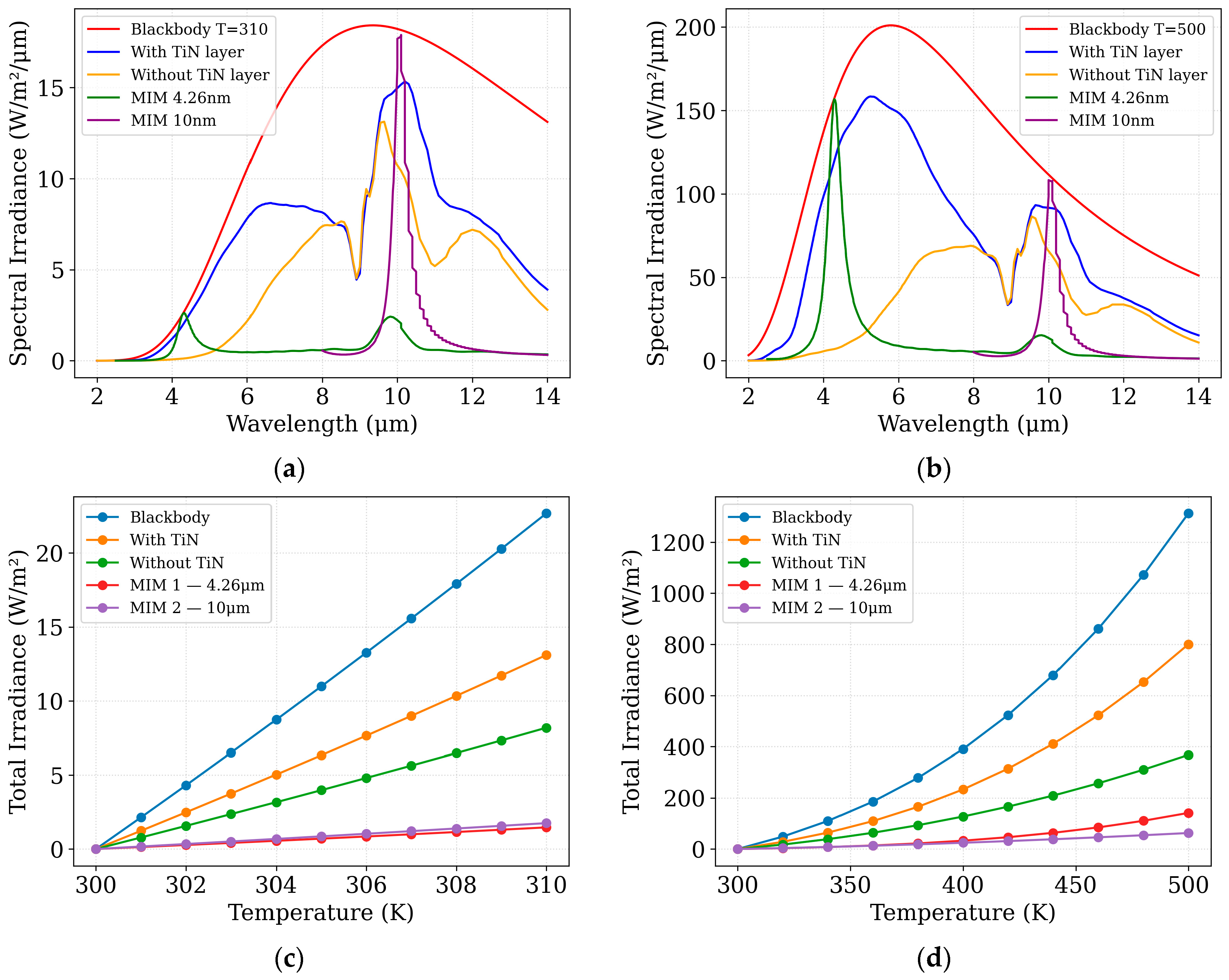 - Configuration 2: Designed for narrowband absorption near 10 µm, suitable for biomedical sensing (e.g., protein vibrational fingerprints) and thermal imaging.