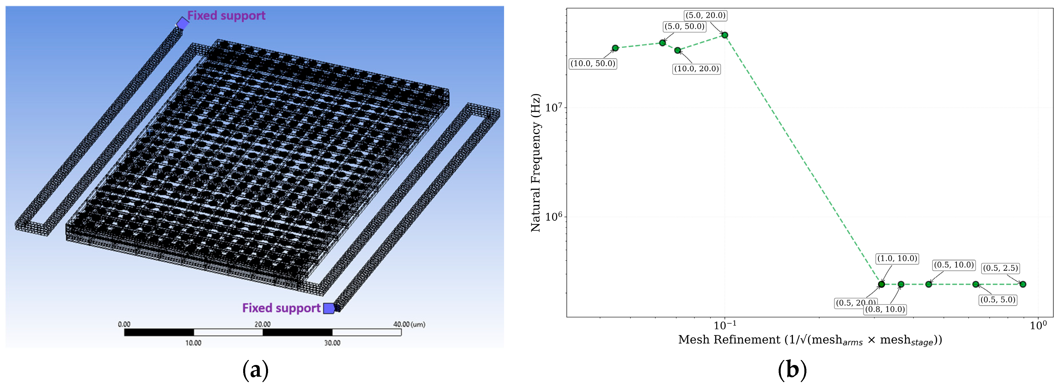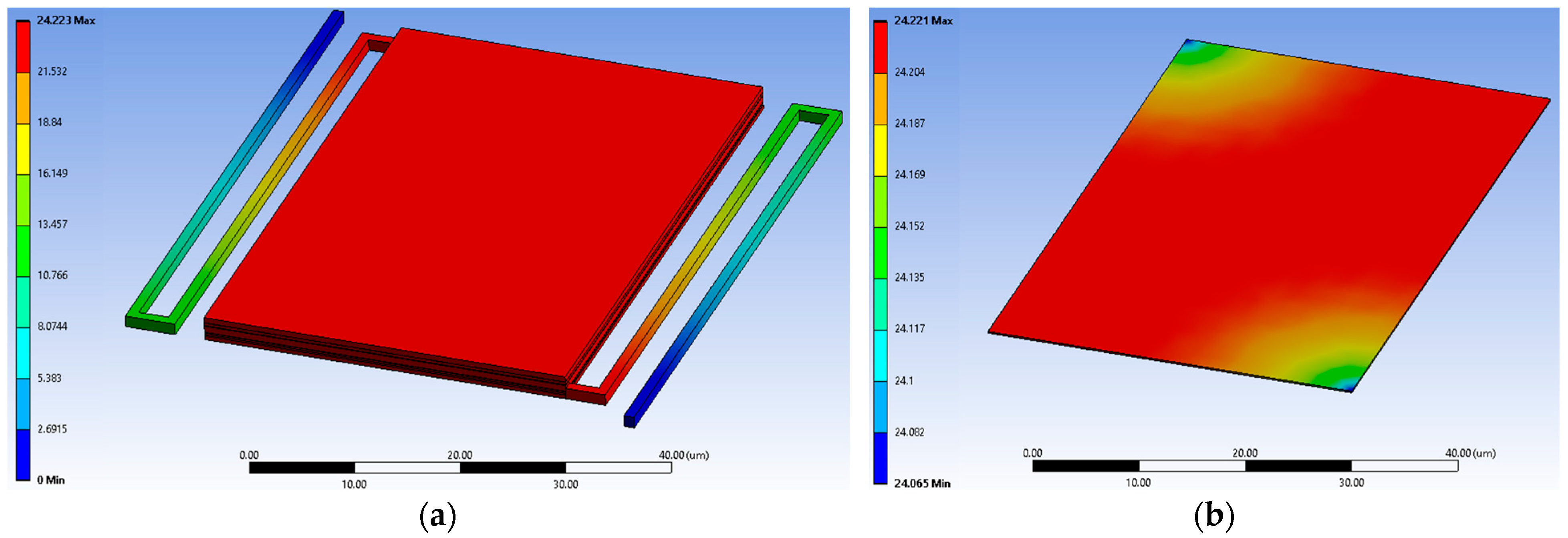 - High-Order Modes ( and ): Arm-Dominated Motion. These modes, occurring at significantly higher frequencies (), primarily involve the bending and twisting of the support arms (Figure 15e,f). Crucially, their frequencies are negligibly affected by the MIM layers. This confirms that the MIM integration selectively affects the stage’s inertial properties while preserving the high stiffness and mechanical integrity of the support structure. The high arm frequencies (the fundamental frequency) are essential for ensuring thermal isolation compliance without introducing low-frequency structural vulnerabilities.