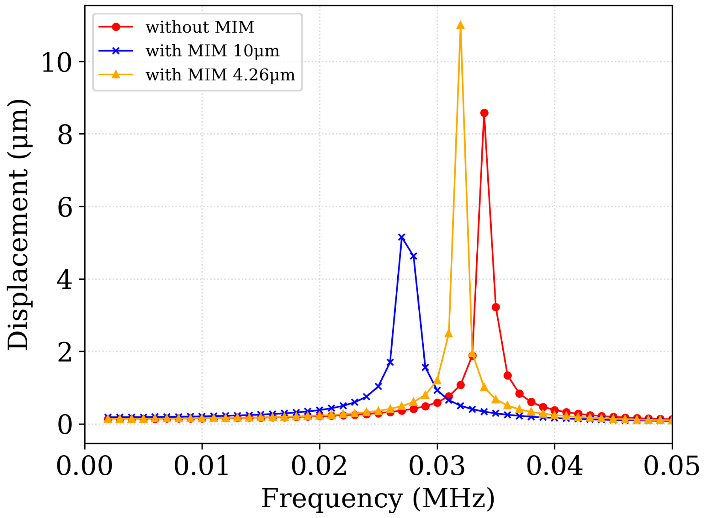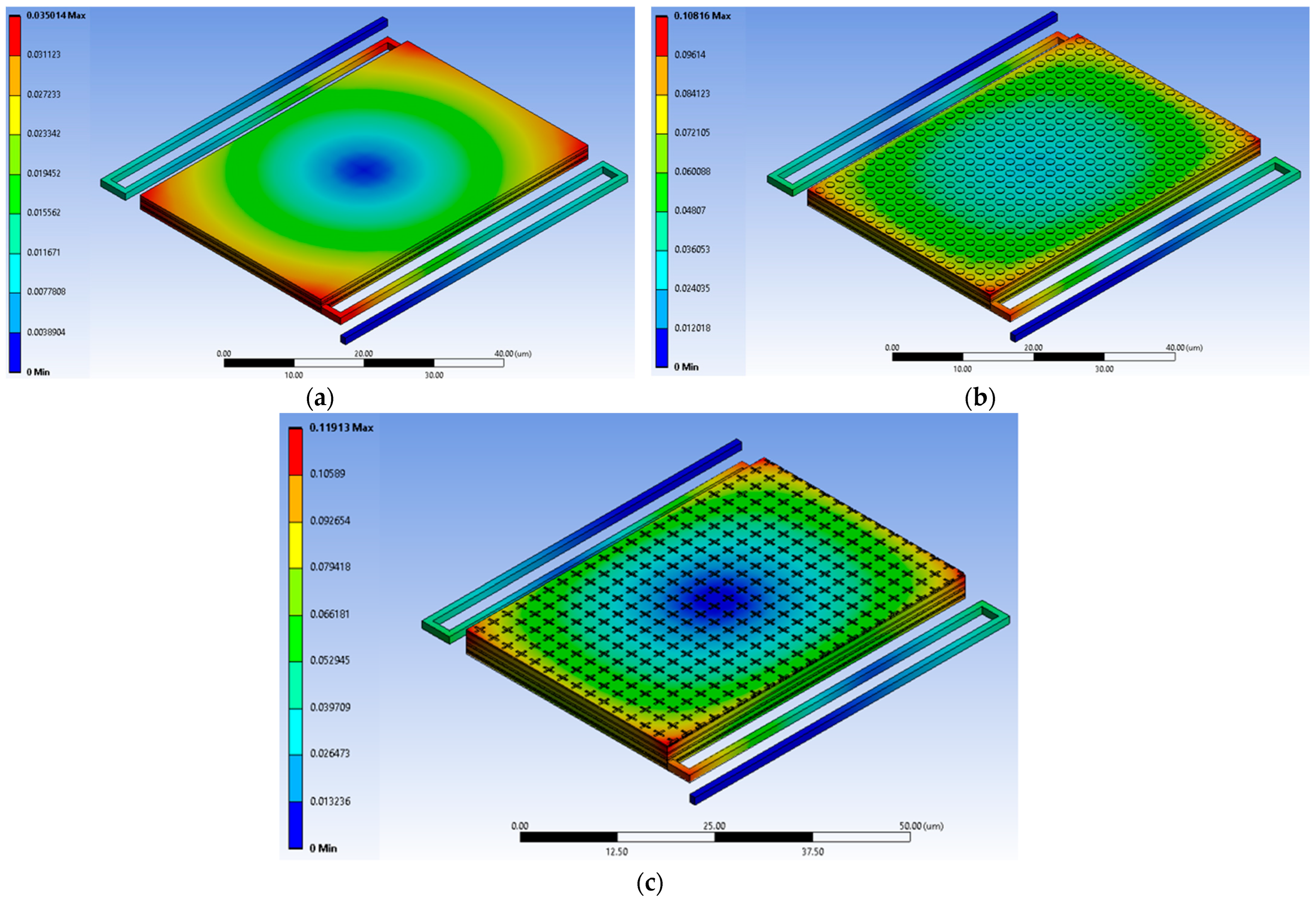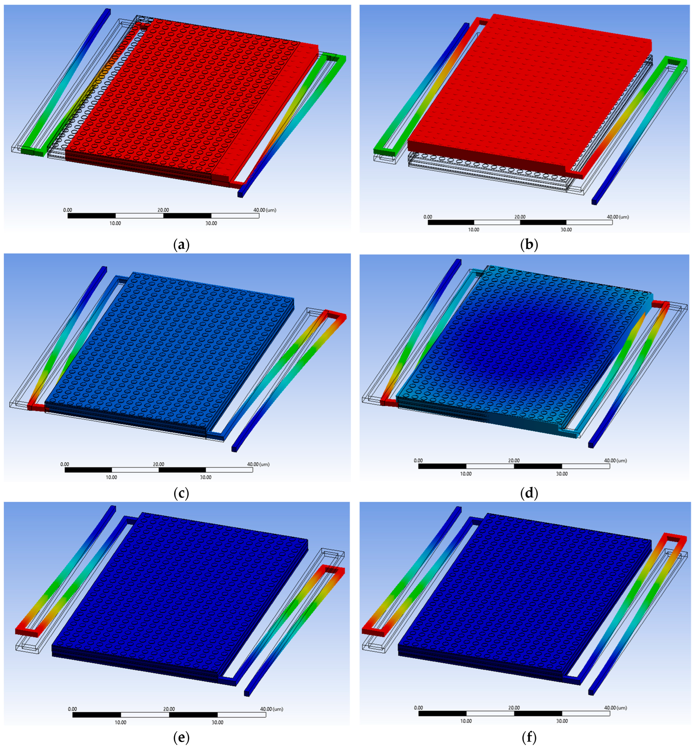 - Low-Order Modes ( to ): Stage-Dominated Motion. These modes exhibit out-of-plane translation, torsional rotation, and combined deformation of the suspended platform itself (Figure 15a–d). The substantial frequency reduction (e.g., dropping from 31.03 kHz to 24.88 kHz with MIM 2) is a direct consequence of the MIM’s mass being concentrated on the suspended stage.