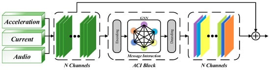The limitations of existing methods restrict the practical application of the current multi-sensor coal-rock cutting state recognition. Therefore, this paper proposes, for the first time, an all-channel interaction (ACI) module based on Graph Neural Networks (GNN). This plug-and-play module mainly consists of feature encoding, information interaction, and feature decoding. In the first part, the input features are mapped to a vector through a multilayer perceptron, achieving comprehensive perception and compression of signal features. The second part uses GNN to ensure information interaction between different channels, perceiving the correlations and contextual information between channels, thus enhancing the network’s expressive ability and performance. The third part is responsible for decoding the response features and correcting the weights according to the shape of the original input. Overall, compared to ordinary convolutional layers, this module is closer to how the human brain processes information. Ordinary convolutional layers typically process features locally and independently at each position, with relatively limited information interaction between channels. Correspondingly, neurons in the human brain form complex neural networks through connections, allowing extensive communication and sharing of information within the network [29].