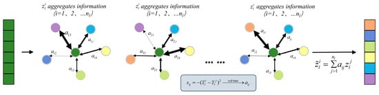 where represents the k-th element of the flattened long vector. By taking the expectation of the encoder’s output shape, the robustness of information interaction is increased. Meanwhile, we define an evaluation metric for the degree of channel interaction. By calculating the negative squared distance, channels with similar features interact more, increasing feature responses and enhancing recognition effectiveness. The distance calculation results are normalized through a softmax layer to obtain the attention weight . This process implements a graph attention mechanism. Each node aggregates information from other nodes based on the calculated attention weight aij and finally updates its feature response. As shown in Figure 3. The final output set is expressed as follows: