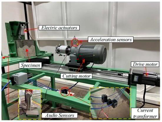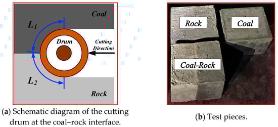 The experimental platform, designed based on similarity theory, uses the EBZ200 large road header as a model, including a cutting mechanism, a traveling mechanism, a fixed mechanism, and a signal measurement system, as shown in Figure 4. The cutting mechanism uses a 380 V three-phase asynchronous reduction motor (Wenling Xiushi Electrical Co., Ltd., Wenling, Zhejiang, China) with a rated power of 550 W and a rated speed of 1500 r/min. The reduction ratio can be adjusted through the gearbox. The cutting head’s maximum diameter is 120 mm, the effective cutting depth is between 50 mm and 70 mm, and the cutting speed is 67 r/min. The traveling mechanism consists of a lead screw slide and a 220 V variable speed motor with a rated power of 120 W, a reduction ratio of 1:15, and an output shaft speed range of 0–90 r/min. Forward and backward movement of the road header is simulated by controlling the forward and reverse rotation of the motor. The signal measurement system consists of a three-phase acceleration sensor CT1010 L (CT1010 L, Shanghai Chengke Electronics Co., Ltd., Shanghai, China), a three-phase current transformer DAM-3505 (DAM-3505, Beijing Altai Technology Development Co., Ltd., Beijing, China)., and an audio sensor, with signal acquisition frequencies of 800 Hz, 50 Hz, and 800 Hz, respectively. The specific parameters of the experimental platform are detailed in Table 1. Before collecting vibration data of coal-rock cutting, three different proportions of coal-rock specimens must be installed on the fixed structure. Top pressure is applied to the specimens through an electric push rod. Data collection starts as soon as the cutting head contacts the specimen surface. Each data sampling duration is no less than 10 s, and multiple repeated experiments are conducted for each sample to ensure data reliability. To simulate underground conditions, we used sand, granular coal, and PC32.5 composite Portland cement to prepare specimens, ensuring that the material properties of the coal and rock samples were similar to natural coal and rock. Three different proportions of coal-rock specimens were prepared in the experiment, representing the rock-cutting process (coal-rock ratio 0:1), the coal-cutting process (coal-rock ratio 1:0), and the coal-rock interface cutting process (coal-rock ratio 1:1), as shown in Figure 5a. The composition ratios of the specimens are detailed in Table 2 [13]. During the preparation of the specimens, we defined the contact arc lengths of the cutting head with coal and rock components, denoted as and , respectively. The coal-rock ratio is determined by . The prepared coal-rock specimens are shown in Figure 5b.