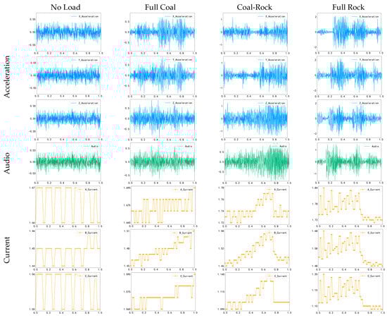 The signals from the three sensors collected in the experiment are shown in Figure 6, including the X, Y, and Z-axis data from the acceleration sensor, audio data, and the A, B, and C pole data from the current sensor. Due to the differences in sampling rates among sensors, this study downsampled the acceleration and audio signals to 50 Hz. This choice was based on the system’s dynamic characteristics. The cutting head rotated at 67 rpm, corresponding to a fundamental frequency of approximately 1.1 Hz, indicating that significant vibration and acoustic signatures induced by coal cutting are primarily concentrated in the low-frequency region. According to the Nyquist sampling theorem, a 50 Hz sampling rate can represent signals up to 25 Hz, making it sufficient to capture essential dynamic characteristics relevant to identification, ensuring fairness in subsequent experiments and balancing data across channels.