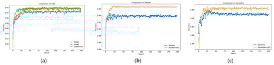 Dataset’s accuracy on different models. (a) CNN. (b) ResNet. (c) DenseNet.