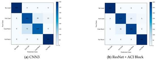 Figure 7 shows the accuracy of the test set for the three model frameworks before and after adding the ACI block. Figure 8 calculates the confusion matrix on the dataset, where the diagonal indicates the number of correct identifications, and the darker the color, the higher the value. It is obvious that errors are more likely to occur when identifying the full-coal and coal-rock interface conditions, but the improved model significantly reduces this issue.