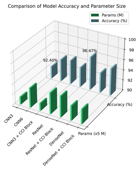 To prove that the ACI block can achieve the performance of deeper models with a small increase in computational parameters, we compared CNN3, CNN6 (6 layers CNN), and CNN3 + ACI block. The experimental results are shown in Figure 9. The results show that with almost equal performance, the model parameters were reduced by 62%. Therefore, we conclude that the ACI block can reduce the model’s depth effectively, achieving a good balance between model complexity and performance.