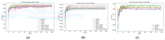 Accuracy of ACI block inserts in different positions. (a) CNN. (b) ResNet. (c) DenseNet.