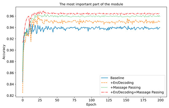 To study the contribution of each component of the ACI block, we independently used the encoder/decoder and information interaction mechanism in the experiment. We chose the best-performing ResNet as the experimental model to simplify variable comparison. The experimental conditions and results are shown in Table 7 and Figure 12. The experimental results show that both parts have an optimization effect on the baseline model. The encoder/decoder, through the advantages of dimensional compression and feature capture, can enhance model performance to a certain extent; the Information interaction mechanism, through information interaction between channels, makes the filter feature responses more diverse, reduces channel redundancy, and thus achieves better results. When these two parts work together, not only is each channel globally perceived, but the network also learns the weight of each channel, significantly enhancing the model’s overall performance and achieving the optimal effect.