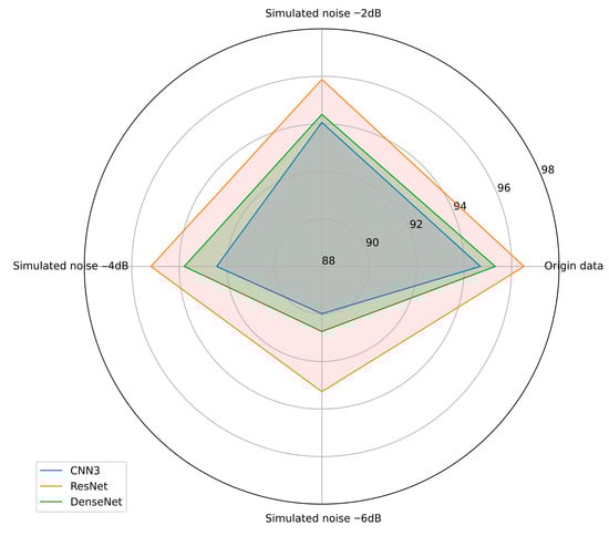 To verify the robustness of the models, we conducted systematic experiments on the three improved models. Specifically, we applied simulated noise of different decibels to the test set data to evaluate their noise resistance capabilities. The experimental results are shown in Figure 13 and Table 9. In these experiments, the noise levels increased from 0 dB to 6 dB to observe the models’ performance under different noise levels. The experimental results showed that the accuracy of all three models did not significantly decrease in noise environments below 4 dB. This indicates that they have good robustness under low noise conditions. However, when the noise level increased to 6 dB, the performance of CNN3 and DenseNet significantly declined, while the ResNet model maintained high accuracy even at 6 dB noise, demonstrating the best noise resistance capability. These results provide important information for assessing the reliability of the improved models in practical applications. It is worth noting that to ensure the fairness of the experiment, we added the same decibels of noise to all three sensors. In actual conditions, the current signal is minimally affected by the environment, so the models’ robustness would theoretically be better than the experimental results.