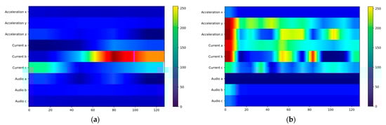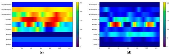 We used Grad-CAM [19] for visualization to more intuitively perceive the feature-capturing ability of the ACI block for multi-sensor data. In the improved CNN3 model, we explored how information interaction enhances feature capturing in each channel. As shown in Figure 14, we extracted heatmaps after inserting the ACI block, with brighter colors indicating more active features and darker colors indicating lower feature weights. Figure 14 shows the activity levels of sensors under various working conditions. The no-load state is the simplest condition, with data from all three sensors showing significant differences from other conditions; the current sensor is most active in Figure 14a. Similarly, the signal differences are pronounced in the all-rock condition; Figure 14d shows that the current and audio sensors are more active. In contrast, the full-coal and coal-rock interface conditions are more difficult to identify than others. At this point, more sensor data is needed for recognition. As shown in Figure 14b,c, multiple channels of the current and acceleration sensors are active, while the audio sensor contributes less to recognition. Using visualization methods, it is demonstrated that the ACI block captures features more comprehensively through information interaction, making fuller use of the multi-sensor data.