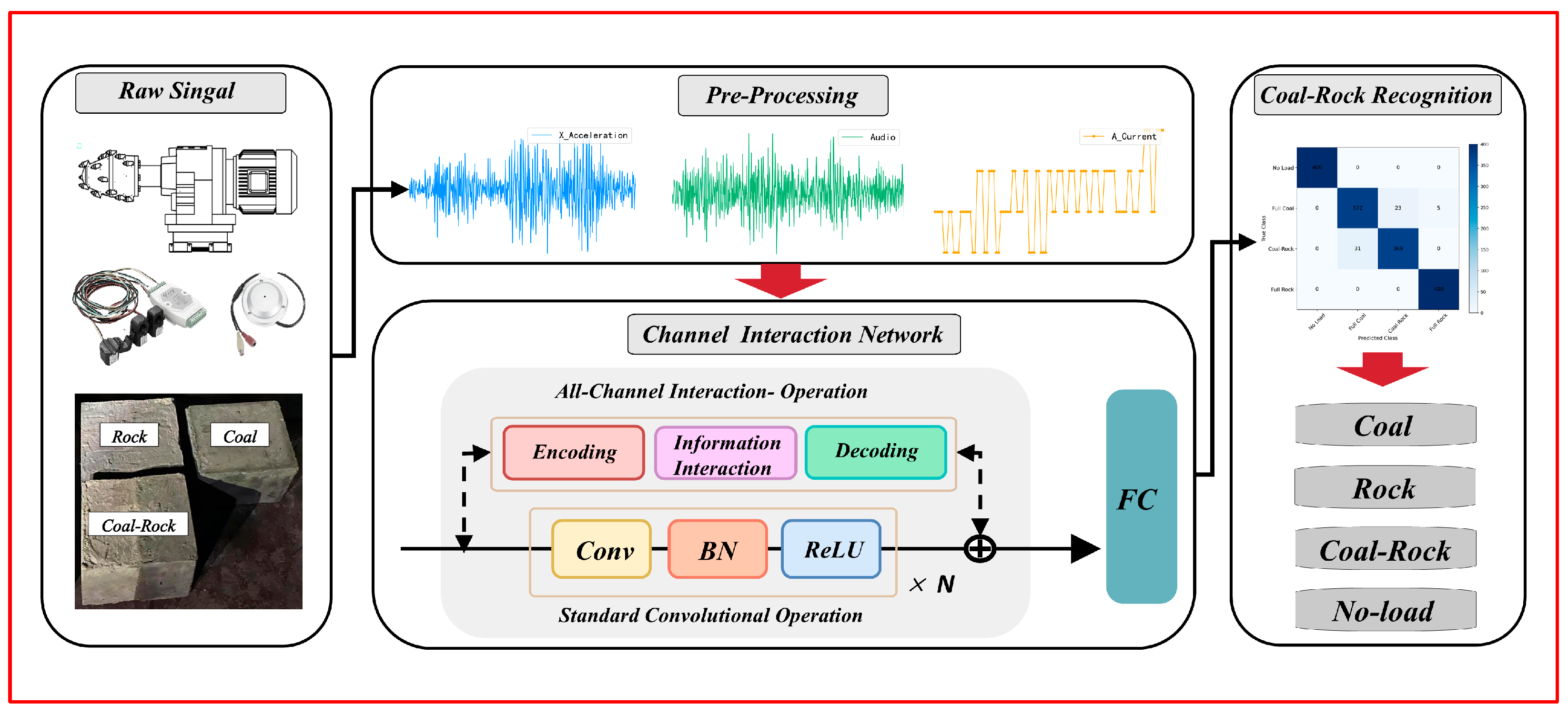 Benefiting from the rapid development of image and optical technology, researchers have begun to explore the direct use of machine vision to determine the cutting medium of the tunnel boring machine. Sun et al. [4] used a gray-level co-occurrence matrix for the feature selection of coal-rock images, achieving an average recognition rate of 94.12% in cross-validation. Si et al. [5] identified coal-rock laser point cloud data through an improved growth algorithm, achieving an accuracy of over 90%. Zhang et al. [6] used a two-dimensional discrete wavelet transform to compare the similarity of coal-rock images for recognition. Wang et al. [7] leveraged infrared thermal image characteristics for dynamic coal–rock interface identification, offering a solution resilient to the low-light conditions underground. Although these methods have made some progress in coal-rock recognition, image signals are often obstructed in actual working environments, and it is challenging to ensure real-time performance. Additionally, optical sensing equipment is expensive and requires high lighting conditions. Therefore, researchers use time series signals during the cutting process for recognition. Scholars such as Jiang et al. [8] established a theoretical model of mechanical signals and the proportion of coal and rock to complete recognition indirectly. Li et al. [9] proposed an improved adaptive noise complete ensemble empirical mode decomposition method to achieve coal-rock recognition based on audio signals. Many studies have proven the effectiveness of time series signals in coal-rock recognition, and it is generally believed that more types of sensors can improve the accuracy and robustness of the recognition task [10,11]. Based on this, Liu et al. [12] proposed a wavelet decomposition recognition method to extract features from vibration, pressure, and current signals. Wang et al. [13] established a feature database of coal-rock cutting current, vibration, and temperature signals, and used fuzzy D-S fusion theory for recognition. However, traditional signal processing methods require much domain-specific prior knowledge, and this complex and diverse feature engineering is not ideal [14,15,16]. Additionally, multi-sensor data fusion methods like the above often come with drawbacks such as data feature loss and high computational complexity, making them unsuitable for actual work environments with limited underground computing resources and model complexity constraints [17].