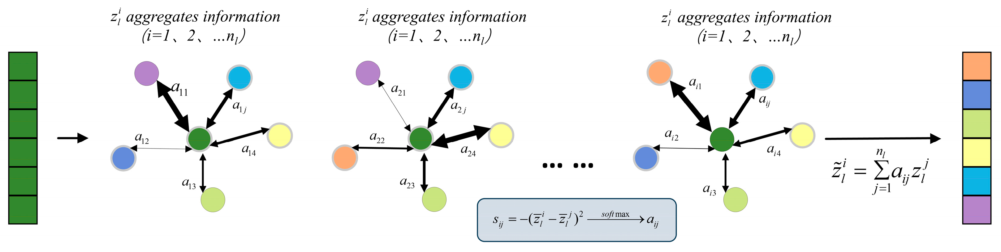 where z l i [ k ] represents the k-th element of the flattened long vector. By taking the expectation of the encoder’s output shape, the robustness of information interaction is increased. Meanwhile, we define an evaluation metric for the degree of channel interaction. By calculating the negative squared distance, channels with similar features interact more, increasing feature responses and enhancing recognition effectiveness. The distance calculation results are normalized through a softmax layer to obtain the attention weight a i j . This process implements a graph attention mechanism. Each node aggregates information from other nodes based on the calculated attention weight aij and finally updates its feature response. As shown in Figure 3. The final output set Z ~ = { z ~ l i } is expressed as follows: