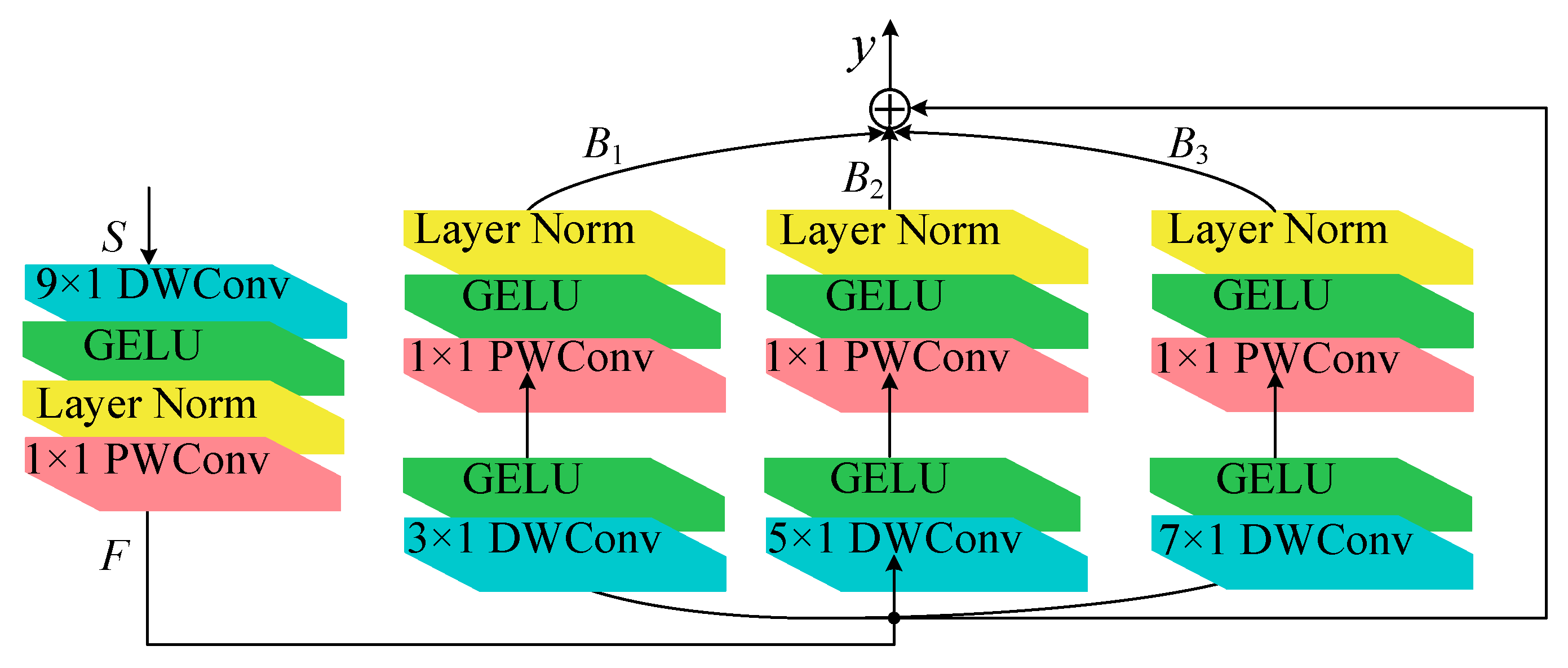 - The MDSR block is proposed to efficiently capture multi-scale feature representations. This module employs multiple branches of depthwise separable convolutions, which significantly reduce computational complexity while accurately capturing multi-scale features. Additionally, MDSR incorporates a residual connection mechanism that effectively preserves the integrity of original features while mitigating gradient vanishing.