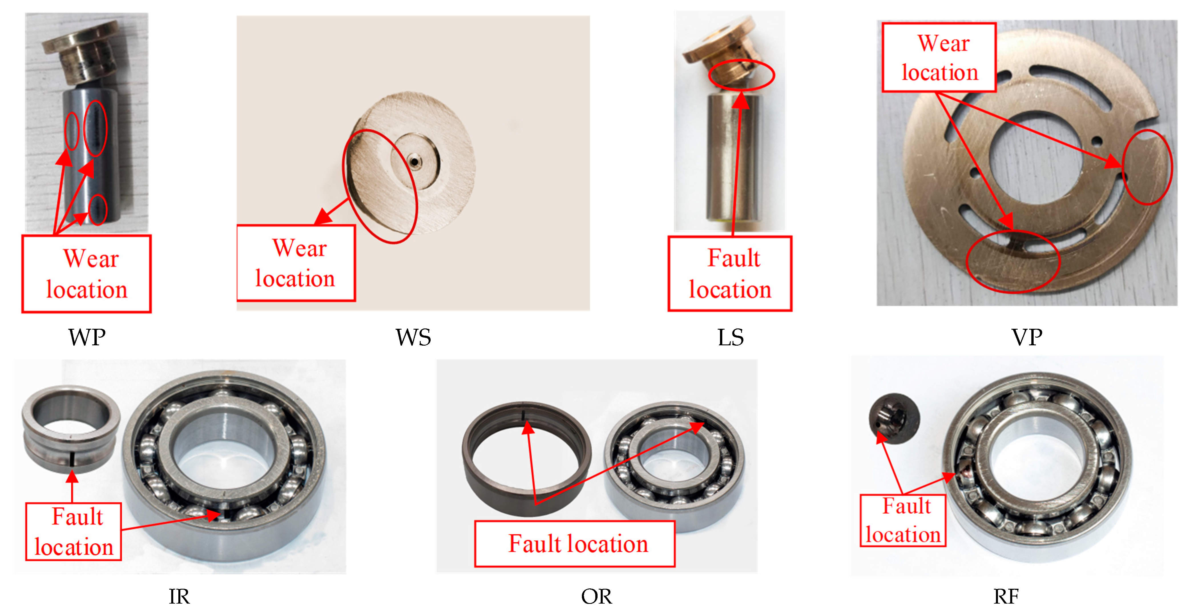 - Xu, X.; Zhang, J.; Huang, W.; Yu, B.; Lyu, F.; Zhang, X.; Xu, B. The loose slipper fault diagnosis of variable-displacement pumps under time-varying operating conditions. Reliab. Eng. Syst. Saf. 2024, 252, 110448. [Google Scholar] [CrossRef]