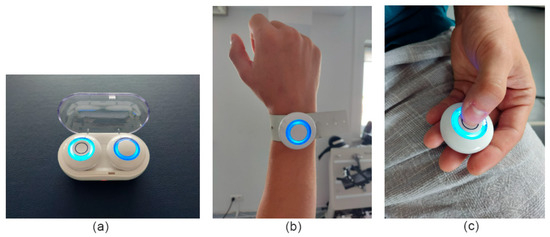 (a) Inertial motion sensor (RSQ Motion) and clicker charging box, (b) sensor fixed by elastic band, and (c) clicker pressed by participant to signalize the angular position.
