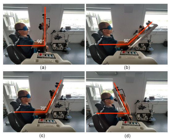 (a) Starting position: 90° of elbow flexion. Assessed angular positions: (b) 50° elbow flexion, (c) 70° elbow flexion and (d) 110° elbow flexion.