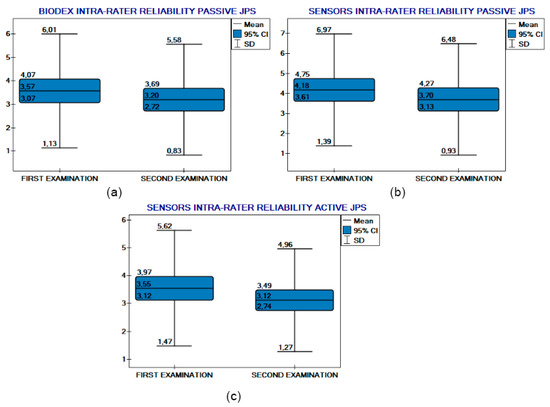 Intra-rater reliability comparison plots. (a) BIODEX intra-rater reliability (passive JPS). RSQ Motion Sensor (b) passive and (c) active JPS intra-rater reliability.