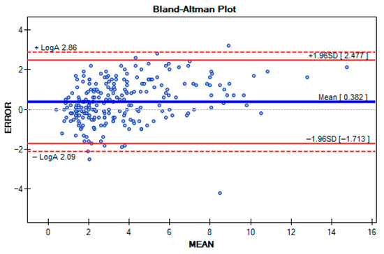 - Gerke, O. Reporting Standards for a Bland-Altman Agreement Analysis: A Review of Methodological Reviews. Diagnostics 2020, 10, 334. [Google Scholar] [CrossRef]
