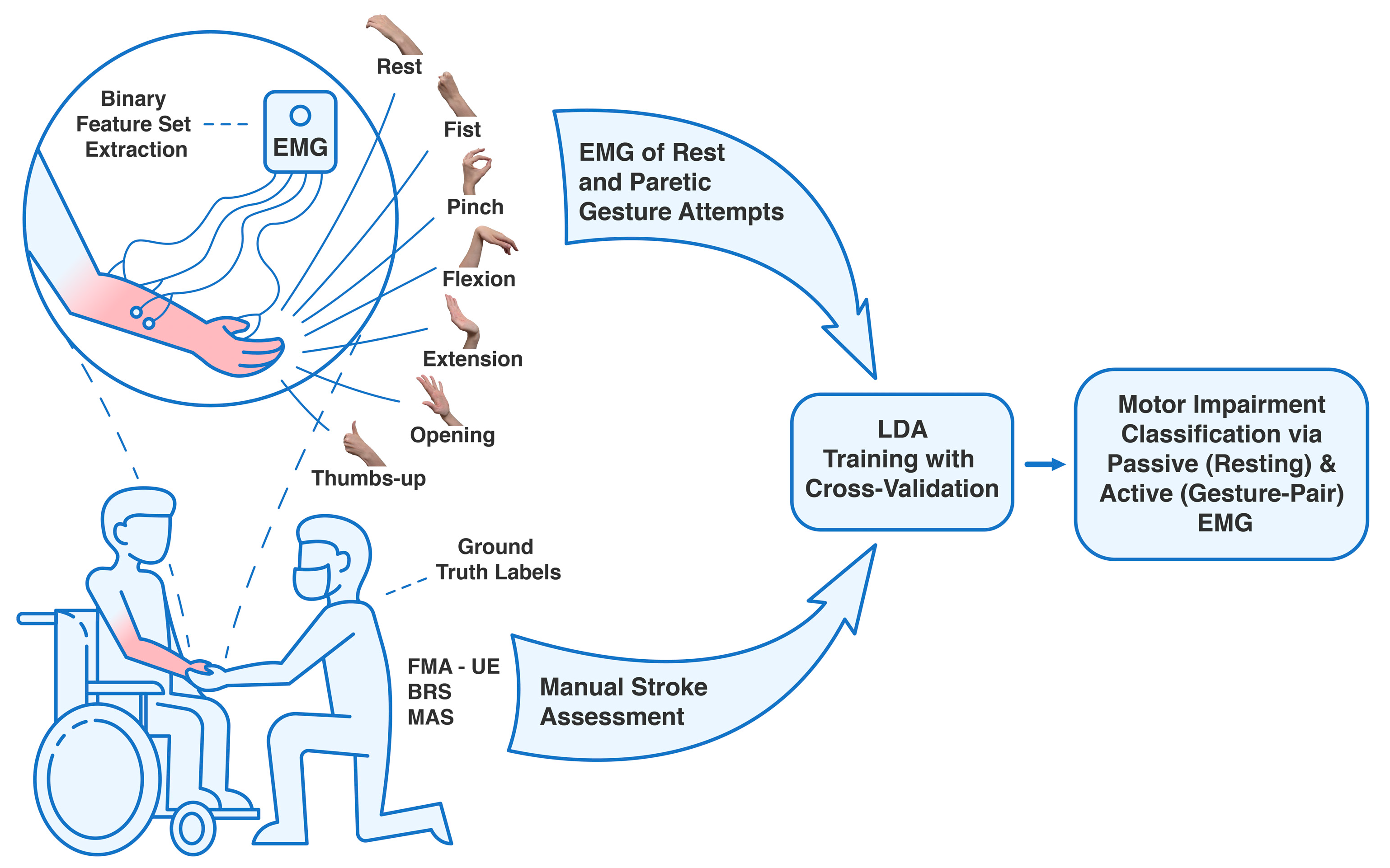 16]. Our novel pipeline incorporates paretic EMG data from subacute stroke patients with weakened or absent movements and relies on a low–channel EMG system with binary feature extraction for each motor scale to classify motor impairment levels via LDA, thereby enabling new applications for wearable electronics in precision medicine.