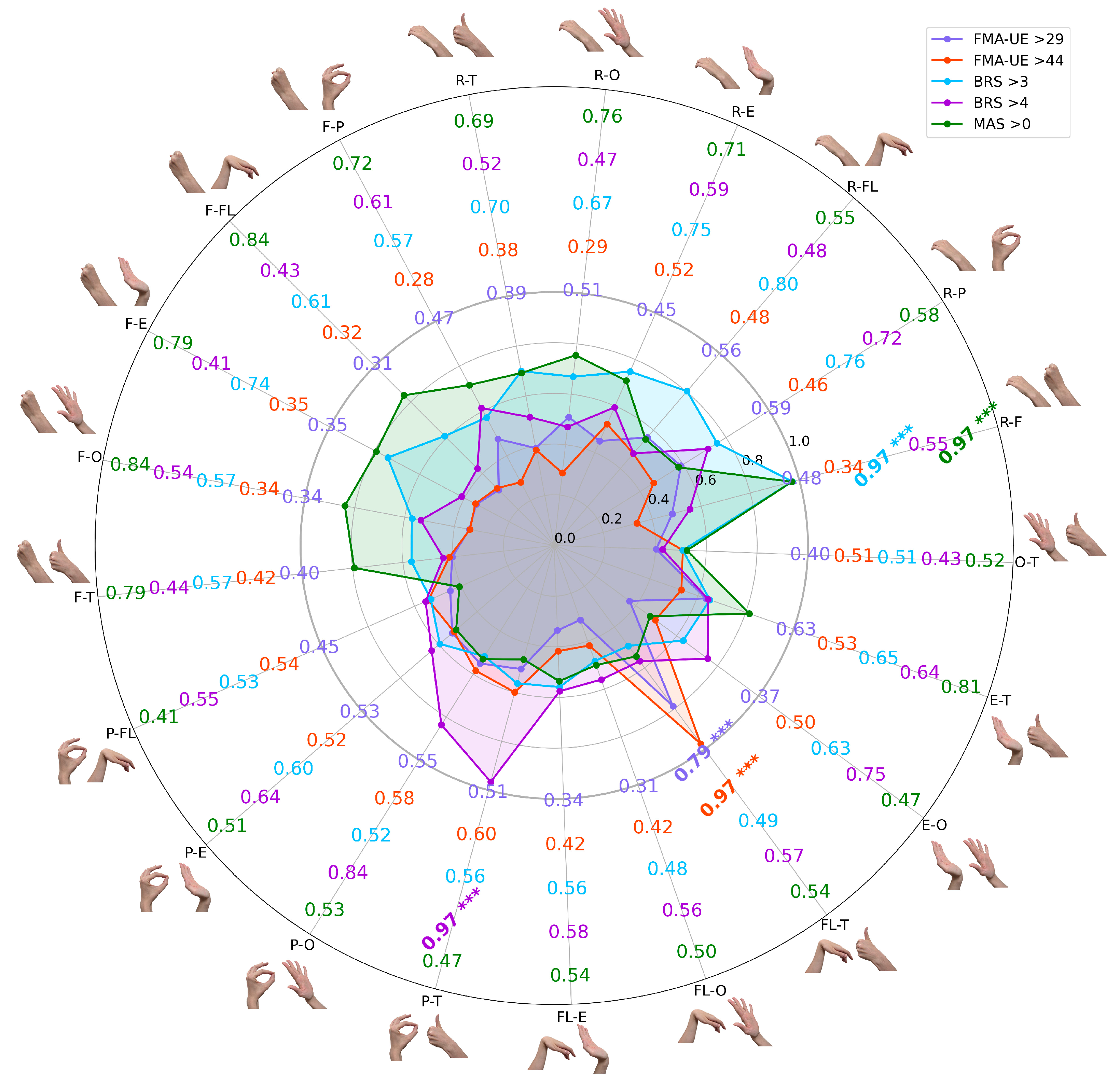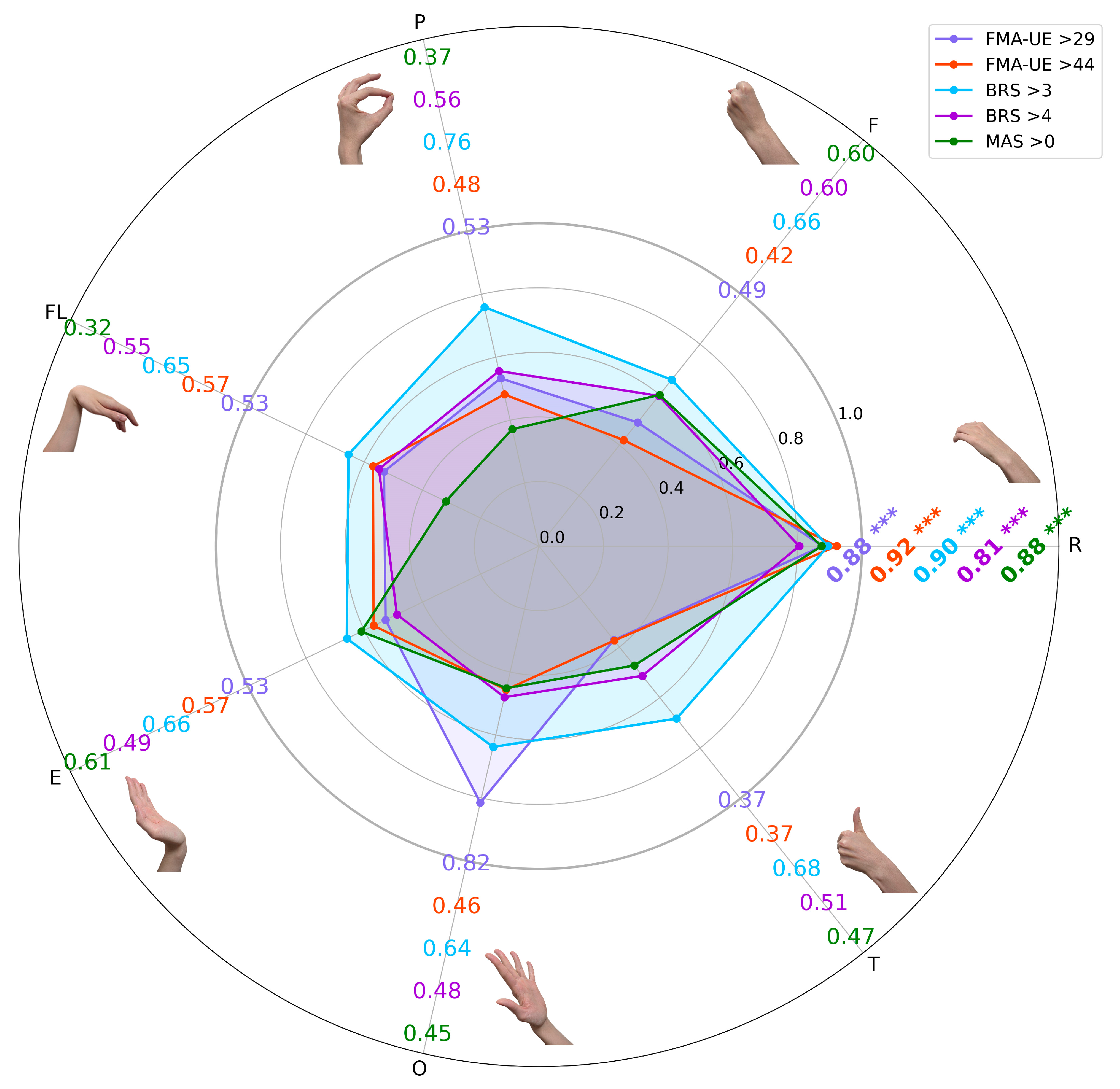 The results revealed unique patterns with statistical significance (p < 0.001) across comparisons, where the highest accuracies reached 0.97 for most thresholds (FMA–UE > 44, BRS > 3, BRS > 4, and MAS > 0), while the maximum for FMA–UE > 29 was 0.79. Notably, for thresholds like BRS > 3 and MAS > 0, a dominant gesture combination emerged, showing significant differences when including a binary combination with the resting EMG gesture class; for example, R–F (rest and fist) was the top performer across these thresholds. Interestingly, across different scales and extracted features (under cross–validation settings), thumbs–up EMG signatures consistently contributed to high accuracy, except for the BRS > 3 classification settings. For illustration, in FMA–UE > 29, lower overall accuracies were observed, but predictive power remained significant (p < 0.001), with thumbs–up gesture labels enhancing results. In FMA–UE > 44, strong performance distinguished mild from moderate–to–severe impairment, specifically boosted by thumbs–up hand movement. For BRS > 3, the approach effectively detected early voluntary control emergence, whereas thumbs–up labels had a negative impact on the model’s binary classification. BRS > 4 highlighted improving movement isolation, with high accuracy from thumbs–up and similar gestures. Finally, MAS > 0 proved robust in identifying spasticity, emphasizing sustained contractions in volitional attempts, with multiple combinations exceeding 0.75.