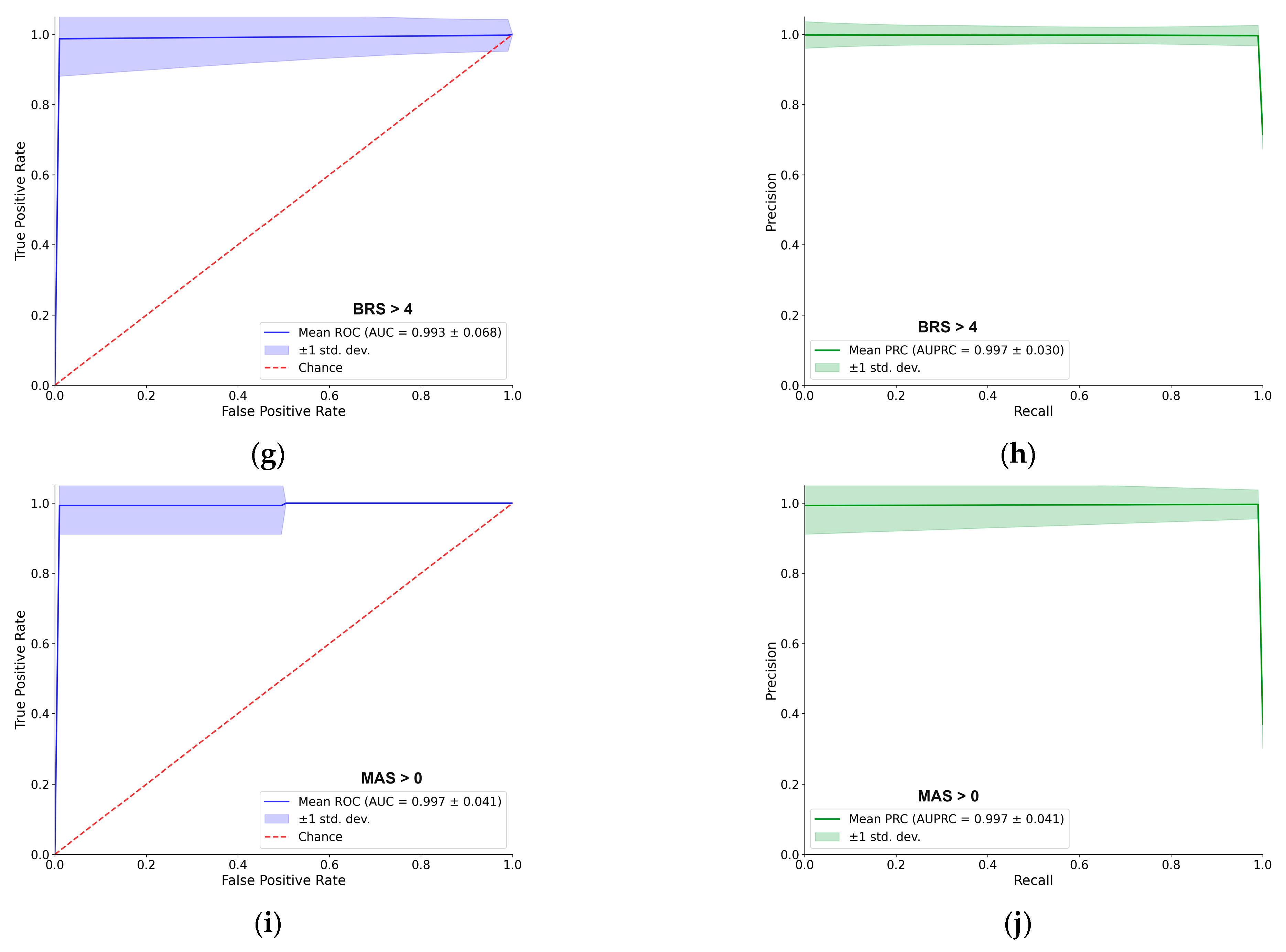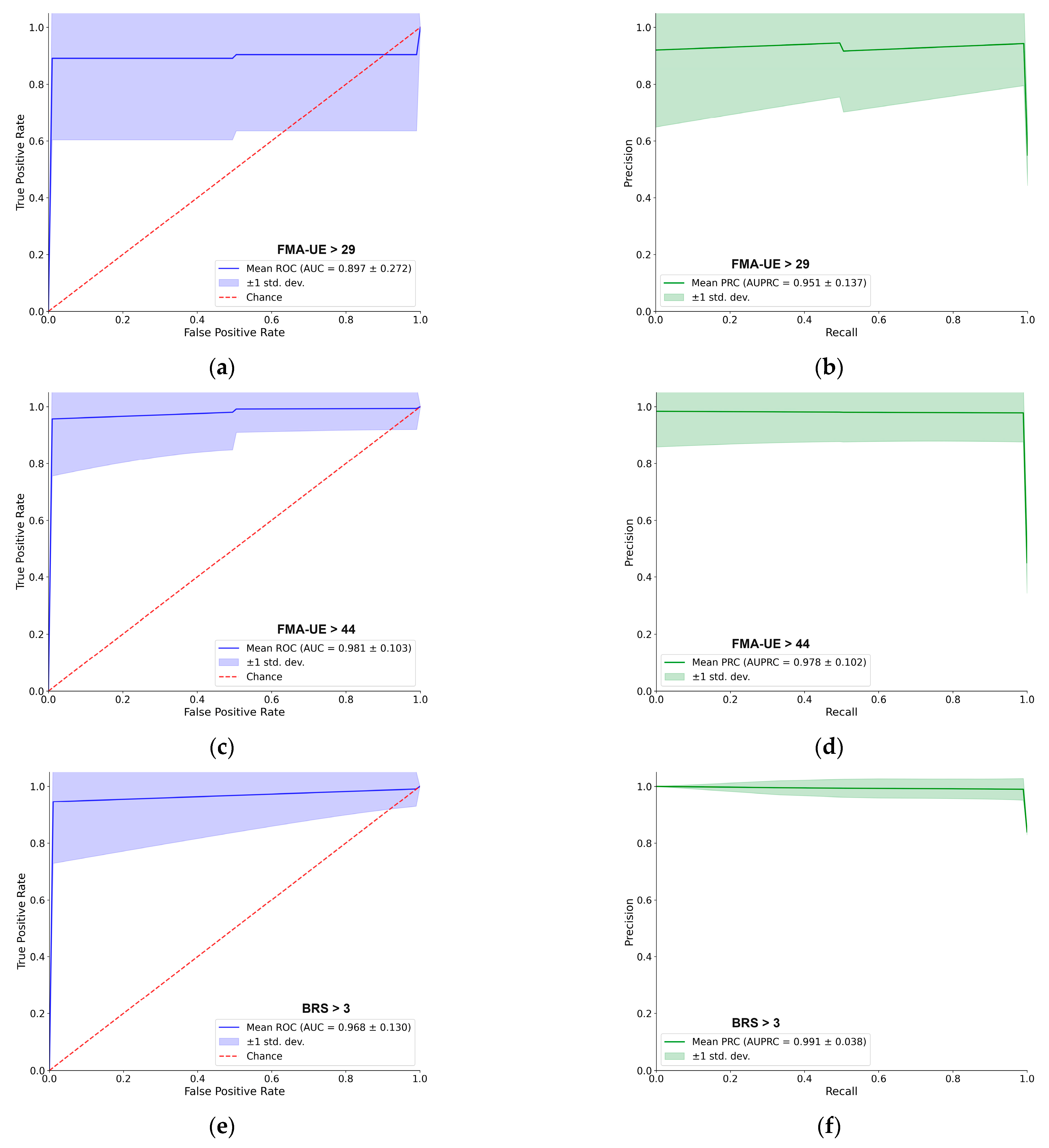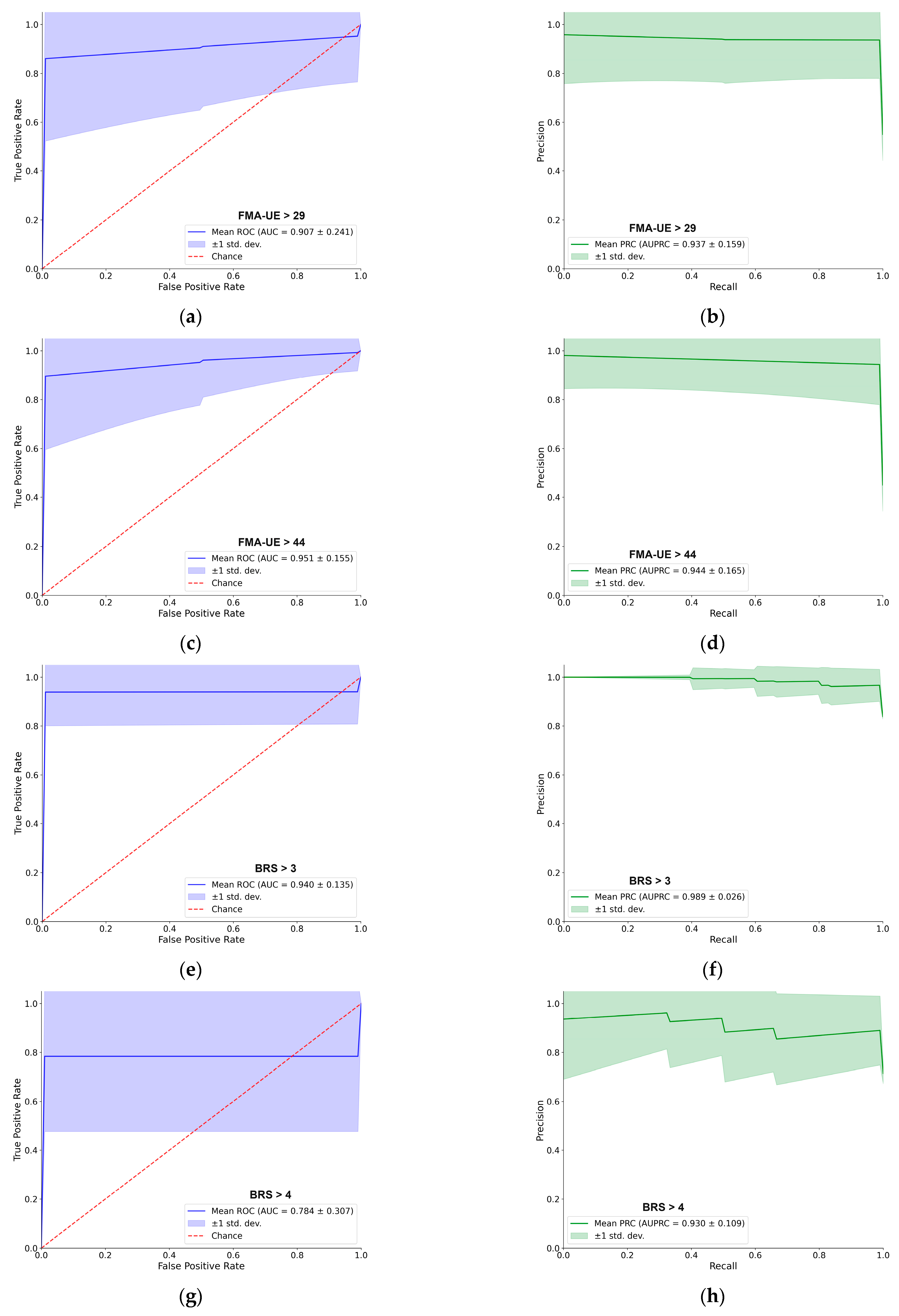 Figure 3 provides a detailed performance evaluation of the LDA classifier for the passive (resting–state) EMG assessment. For each of the five clinical thresholds, the figure presents both the ROC and PRC. Overall, the LDA demonstrated excellent predictive capacity. For most tasks, the AUC–ROC was approximately 0.90 or higher, and the AUC–PRC was around 0.95. A notable exception was the BRS > 4 classification, which yielded a lower AUC–ROC of 0.78, although the AUC–PRC remained high at 0.93. The shape of the PRC for this specific task also indicates some instability in precision across different recall levels. Each curve represents the mean performance across 100 cross–validation iterations, with the shaded region indicating the ±1 standard deviation, providing a clear visualization of the consistency of supervised models [