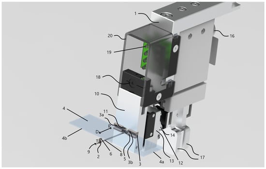 Custom magazine and slide manipulator design created in Solid Edge. Numbered components: 1—robot manipulator assembly, 2—primary gripper, 3—secondary gripper, 3a—first half of the secondary gripper, 3b—second half of the secondary gripper, 4—standard slides, 4a—short edge of a slide, 4b—long edge of a slide, 5—prismatic edge of the secondary gripper (longer), 6—prismatic edge of the primary gripper (shorter), 7—magazine, 8—slide support rod, 9—end of the support rod, 10—metal frame, 11—hole machined into the metal frame, 12—multi-spring members, 13—metal subframe for the springs, 14—translational unit of the actuator, 15—rotational unit of the actuator, 16—robotic arm, 17—magazine clamps, 18—miniature endoscope camera, 19—LED lighting module, 20—plastic diffusing cover.