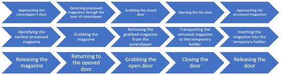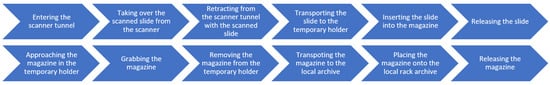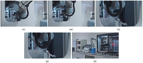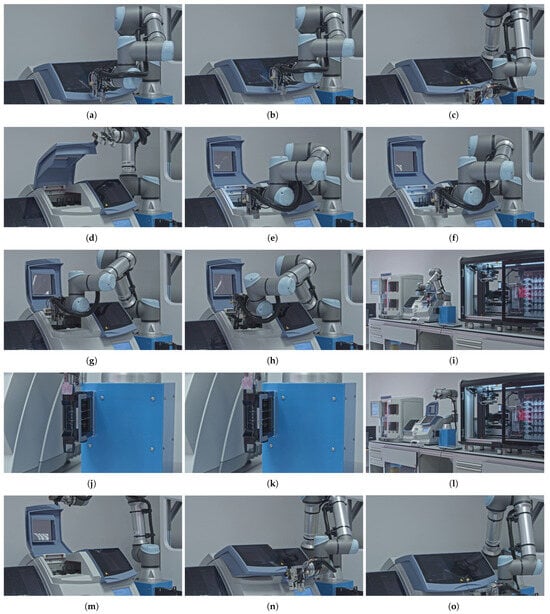 An overview of the magazine manipulation workflow process is provided in Figure 3, highlighting the sequence of the operations. The sequence steps in the diagram are aligned with the elements presented in the corresponding subfigures in Figure 4 that illustrate the key stages of an automated magazine manipulation performed by the robotic arm. Starting with the arm approaching the coverslipper’s door (a), then the system detects the presence of processed magazines (b). After that, it grasps and opens the door (c, d) to gain access to the magazines (e). Subsequently, the vision-based system identifies the earliest processed magazine from the stack (f), allowing the arm to grab it (g) and remove it from the coverslipper (h). The retrieved magazine is then transported to a temporary magazine holder of the robot (i), where it is thereafter accurately inserted (j) and released (k). Finally, the robot returns to the coverslipper’s door (l), grasps (m), closes (n), and releases it (o), completing a full cycle of magazine retrieval.