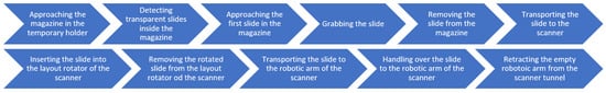Our current research builds upon prior methodological contributions to establish a high-level mapping between specific laboratory subtasks and corresponding robot arm movements. This mapping ensures the general feasibility and implementation of the proposed automation framework. The technical foundation for this work is derived from several key advancements: a detailed investigation into magazine detection, position determination, software architecture, and communication protocols [55] (see also Supplementary Materials Video S1: experimental_magazine_detection_phase_1); the development and evaluation of a patented, unique gripper and a system for slide detection and manipulation, which addressed the complexities of handling transparent objects and various slide types [56,57]; and the implementation of a three-point robot calibration method, which was benchmarked against manual and mechanical approaches [58]. The insights gained from these foundational studies enabled the abstraction of tissue preparation processes into a set of generalized robotic movements, thereby providing a versatile framework for automating a range of laboratory procedures.