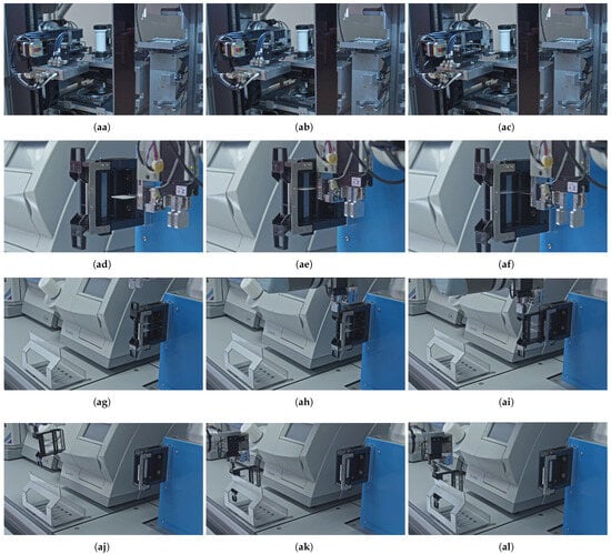 Based on the analysis of the program code related to the subtasks, Table 6 presents a detailed decomposition of the robot movements, mapping the sub-steps of automated magazine manipulation to the required degrees of freedom (DOFs) of the robotic arm. The columns Rot. X, Rot. Y, and Rot. Z and Trans. X, Trans. Y, and Trans. Z indicate the rotational and translational movements, respectively, with a plus sign (+) denoting an active DOF for a given step. The TCP manipulator column specifies which element of the manipulator (e.g., LED, camera, image processing, or specific gripper) is actively used during each operation. Additionally, both the door and the magazine grippers contribute an additional translational DOF each, which is added in parallel at the end of the robot’s existing kinematic chain—one on each side of the manipulator. The Sum column quantifies the number of DOF required for each individual sub-step, while the Cumulative amount column tracks the number of unique DOF utilized so far during the entire process. Thus, the final Cumulative amount represents the total DOF necessary to complete the entire automated magazine handling task. For two steps, where the symbol “↔” appears next to the step identifier (letter label), it indicates that the motion sequence involves the same combination of movements but executed in opposite directions (for example, Opening vs. Closing a door). Additionally, the symbol “=” at the identifier denotes motion steps that are equivalent in terms of movement composition but belong to different workflows.