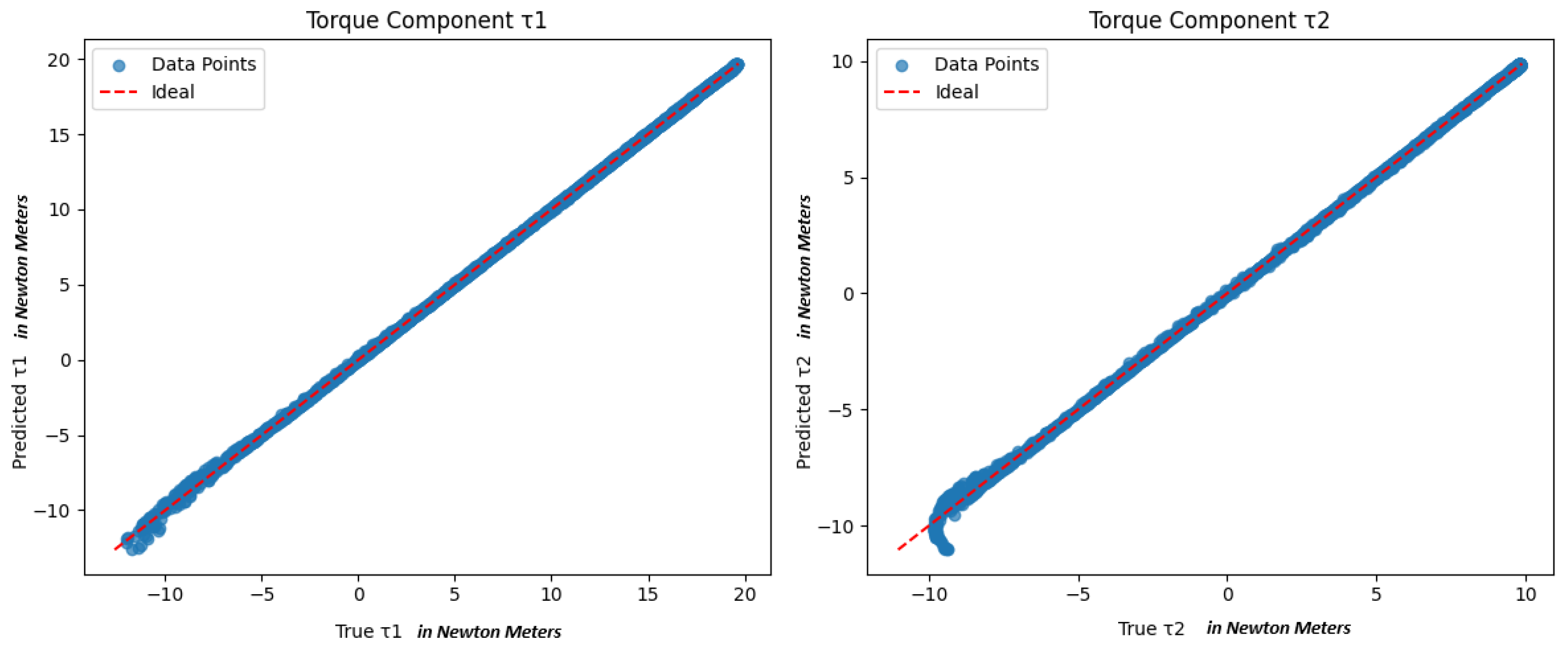 value of about 0.9997 on the test set. This near-perfect alignment is also evident in the scatter plots of predicted versus true torque components, where the data points lie almost exactly on the ideal
