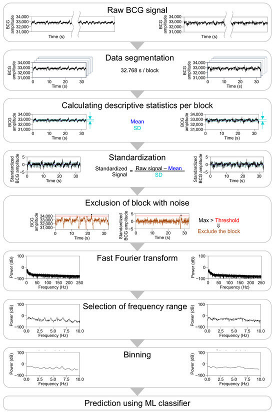 We then performed a fast Fourier transform (FFT) on the standardized BCG amplitude per block with a Hanning window using the Python library (SciPy 1.10.1) and used specific frequency ranges for the analysis. The examined cutoff frequencies are listed in Table 1 and the preprocessing pipeline is shown in Figure 2.