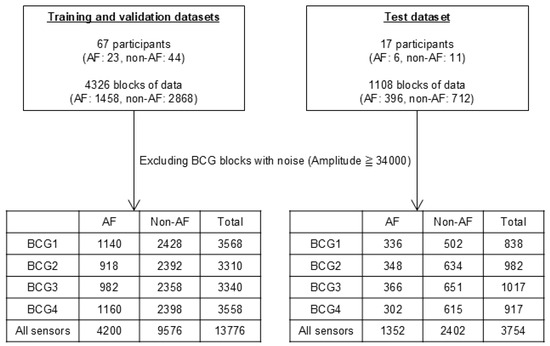 A flowchart detailing the data composition is presented in Figure 3. A total of 5434 blocks from 84 participants were used in this study. We prepared three datasets: training and validation datasets comprising 4326 blocks from 67 participants and a test dataset comprising 1108 blocks from another 17 participants. After excluding blocks with body motion artifacts (BCG amplitude > 34,000), the training and validation datasets were used to train and optimize the ML classifiers. The test dataset was used to evaluate the results obtained using the optimized ML classifiers. The training, validation, and test datasets were derived from different participants to avoid overfitting. We used data from each of the four sensors separately and analyzed the combined BCG data from all the sensors. Thus, we used five datasets (BCG1, BCG2, BCG3, BCG4, and all sensor data).