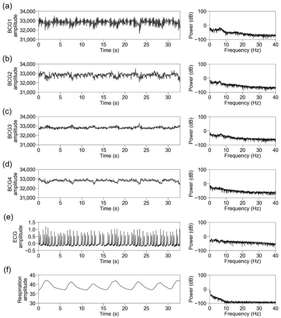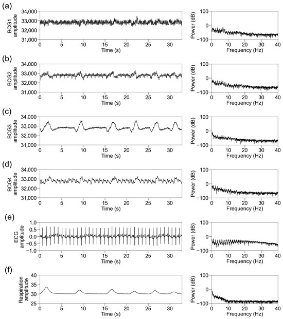 Representative traces in participants with sinus rhythm. Representative traces of BCG1 (a), BCG2 (b), BCG3 (c), BCG4 (d), ECG (e), and respiration signal (f) during one block (32.768 s). (Left panel) Raw wave for one block. (Right panel) Power spectrum below 40 Hz after fast Fourier transform. BCG, ballistocardiogram; ECG, electrocardiogram.