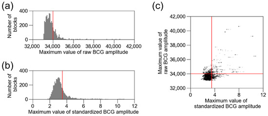 To remove external noise, we tested two strategies: raw amplitude-based and standardized amplitude-based thresholds. Figure 6a shows the distribution of the raw amplitude, and Figure 6b shows the standardized amplitude in the training and validation datasets of BCG2. Both histograms show a right-skewed distribution. We excluded blocks with a BCG amplitude > 34,000 as the initial value, based on preliminary measurements. The threshold for a raw BCG amplitude > 34,000 excluded 23% of the data. When the standardized BCG amplitude-based threshold was set to exclude the same portion of data, the threshold was 3.4934. The distribution of the excluded data differed between the raw and standardized thresholds (Figure 6c). Table 5 shows the changes in the number of included data and accuracy in the training and validation datasets. The exclusion of raw BCG amplitudes > 34,000 resulted in the highest accuracy. Therefore, we decided to continue using this threshold.