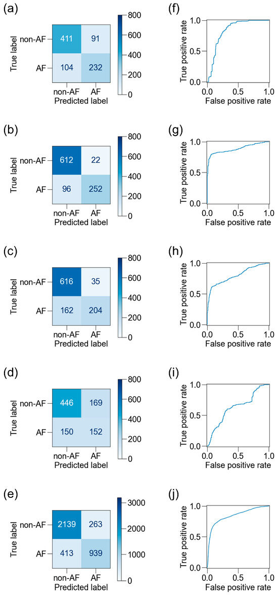 Confusion matrices and receiver operating characteristic (ROC) curves for BCG sensors. Confusion matrices on the test dataset are shown for the best ML classifiers for BCG1 (a), BCG2 (b), BCG3 (c), BCG4 (d), and a combination of all four sensors (e), and the corresponding ROC curves are shown (f–j). The accuracy was highest and the area under the ROC curve was largest in BCG2. BCG, ballistocardiogram; ML, machine learning.