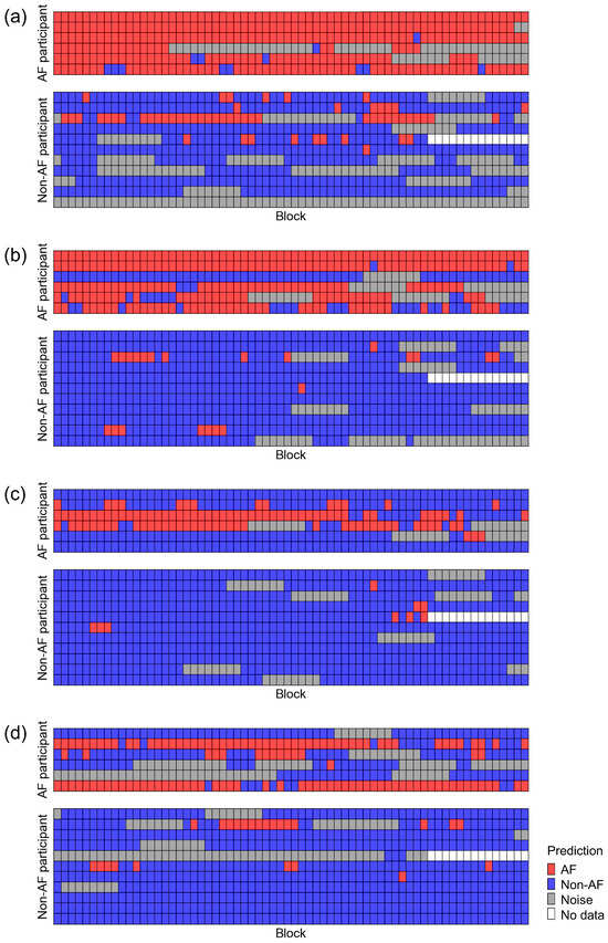 Classification results of the test dataset using the best classifier for BCG2. Datasets recorded using BCG1 (a), BCG2 (b), BCG3 (c), and BCG4 (d) sensors were classified using the best classifier for BCG2 (ADA for BCG2). A test dataset consisted of 6 AF participants (upper panel) and 11 non-AF participants (lower panel). AF, atrial fibrillation; BCG, ballistocardiogram.