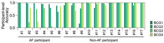 Because the BCG data were recorded for 5 min, they consisted of 66 blocks for each participant. We checked the predictions of ADA for BCG2 for all BCG data for each participant (Figure 8). The prediction accuracy for the BCG2 dataset was almost correct, except for one participant in the AF group who showed some false negative blocks. In the BCG1 dataset, the number of false positive blocks increased, whereas the number of false negative blocks decreased slightly. In the BCG3 and BCG4 datasets, the number of false negative blocks increased, resulting in a reduced recall. However, the number of false positive blocks did not increase in the BCG 3 and BCG4 datasets. Therefore, the ADA for BCG2 maintained high precision for all BCG data. Participant-level accuracies are summarized in Figure 9. BCG2 data exhibited low accuracy (0.00) only in participant #3, who was of relatively small stature (140 cm tall and weighing 37 kg). In addition, BCG3 and BCG4 data in participants #1 and #5 showed low accuracy. We found that the raw waveforms of BCG3 and BCG4 in these participants had very small signals in phases matched with ECG.