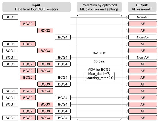 System architecture of combination analysis of BCG data recorded at multiple locations. All data were analyzed using ADA for BCG2 with the best settings. The block was classified as AF if any one prediction from the data was AF. For example, when the model classified data from BCG2 and BCG3 as AF, all combinations including BCG2 or BCG3 were predicted as AF. BCG, ballistocardiogram; ML, machine learning; AF, atrial fibrillation; ADA, AdaBoost classifier.