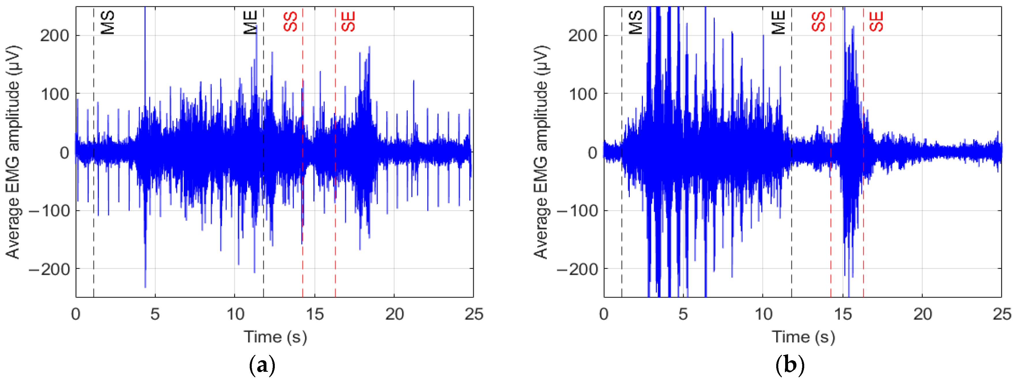 - Merletti, R.; Muceli, S. Tutorial. Surface EMG detection in space and time: Best practices. J. Electromyogr. Kinesiol. 2019, 49, 102363. [Google Scholar] [CrossRef]