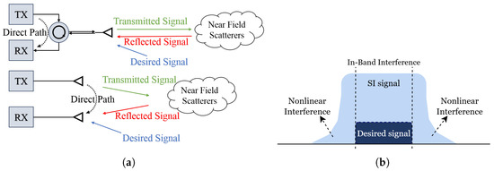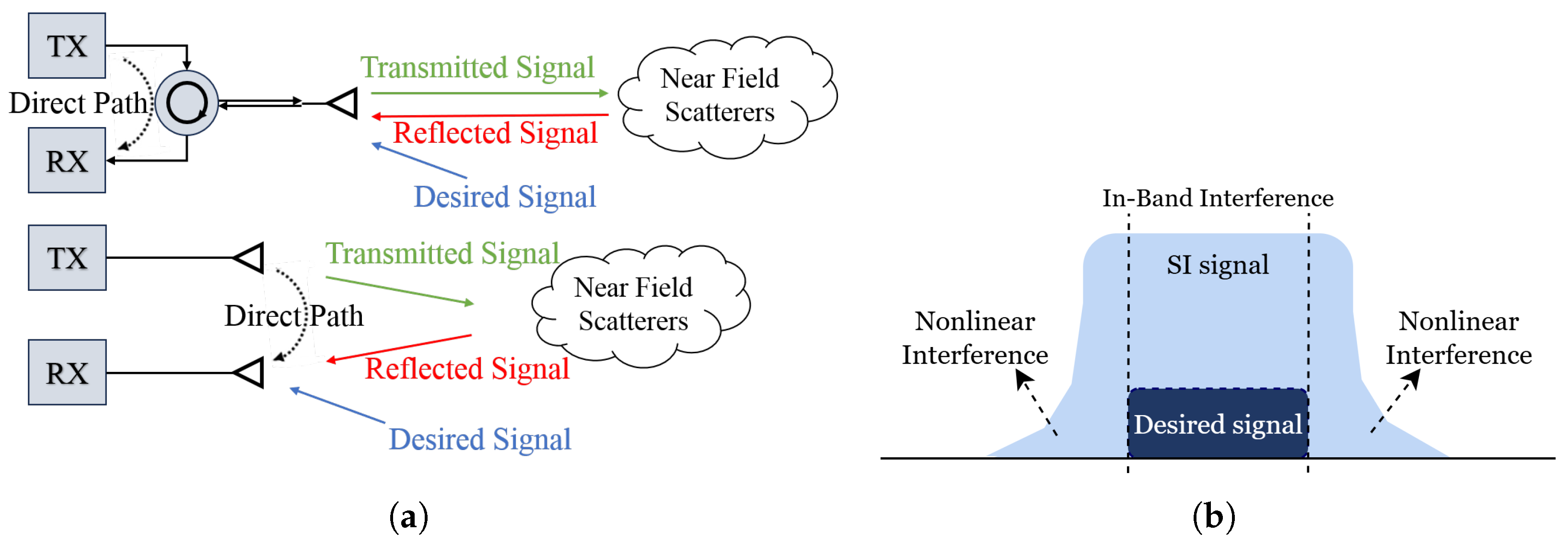 Figure 2a illustrates SI in two distinct IBFD configurations: one employing a circulator and the other utilizing separate antennas for transmission and reception. In the circulator-based approach, a single antenna is shared for both the transmitter (TX) and receiver (RX), with the circulator separating the transmitted and received signals. However, this setup fails to completely isolate the transmitted signal, resulting in SI from both direct leakage and reflections caused by near-field scatterers in the receiver. On the other hand, the antenna separation-based design mitigates direct leakage using dedicated TX and RX antennas, yet remains susceptible to SI due to signal coupling from the sidelobes of the TX’s antenna and environmental reflections [