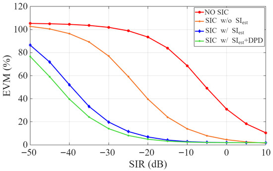Besides SNR, another metric that significantly impacts the levels of SIC is the signal-to-interference ratio (SIR), which quantifies the ratio between the mean power of the desired signal and the mean power of the SI signal at the receiver—i.e., .