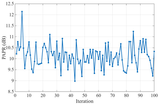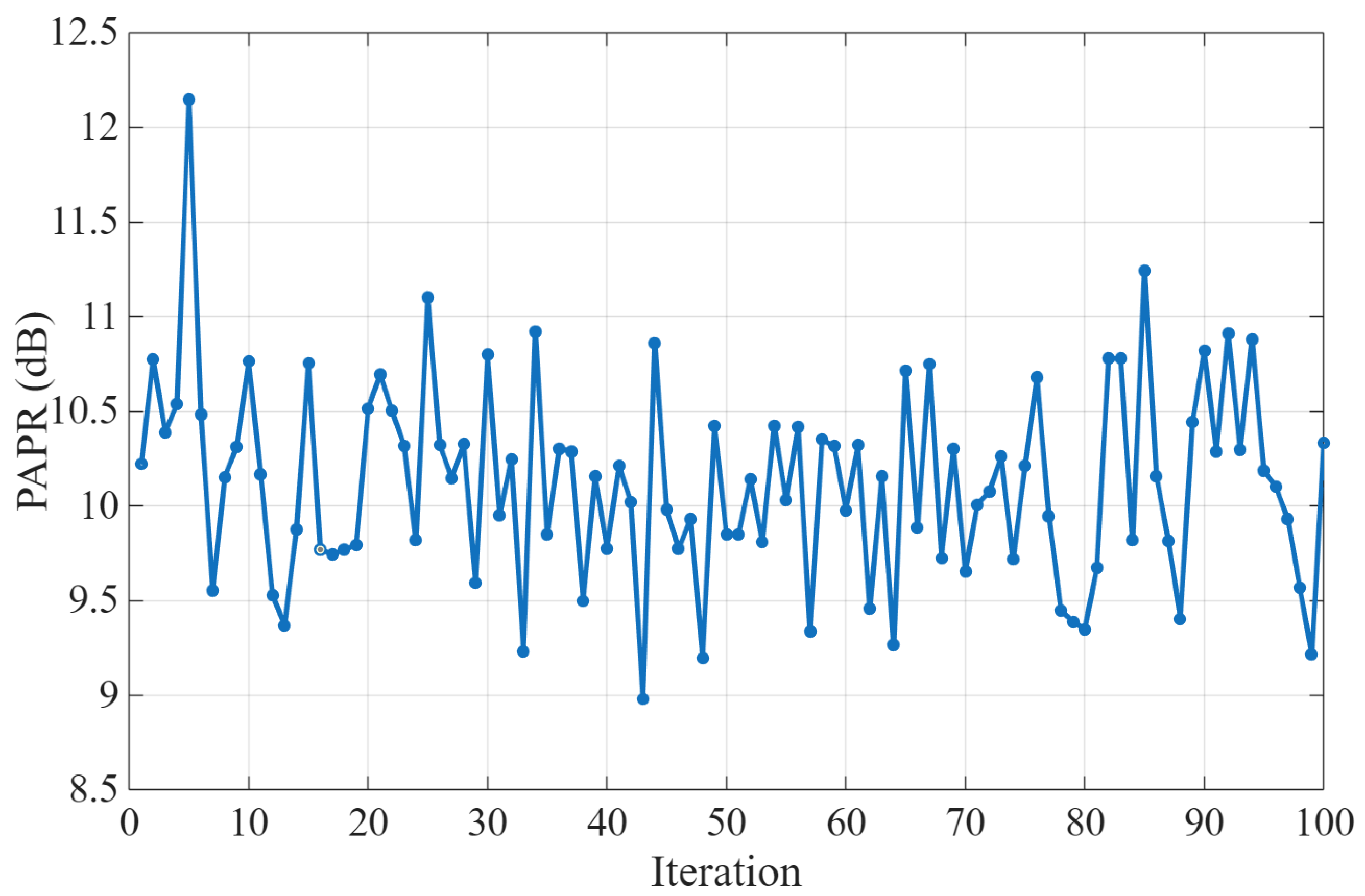 Figure 8, the peak-to-average power ratio (PAPR) varies across iterations for the 64-QAM OFDM transmitted signals with 100 MHz bandwidth. A comparable behavior is observed for the 16-QAM OFDM desired signal with 20 MHz bandwidth.