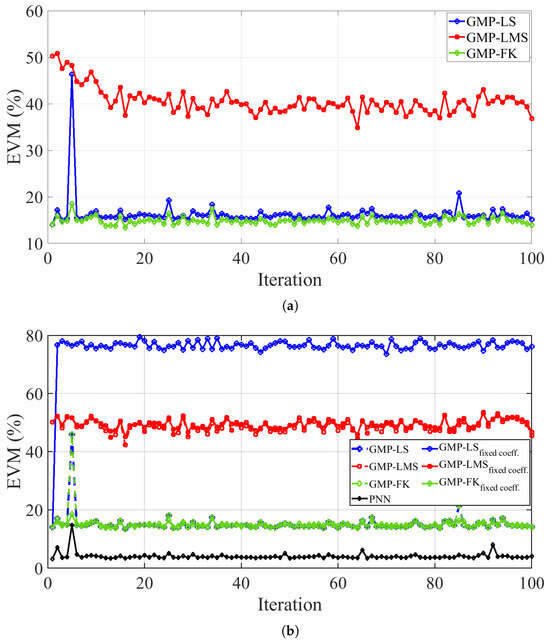 Figure 9b shows the case where the coefficients are not continuously updated; they are computed only once at the first iteration and then reused for all subsequent iterations. In addition to the GMP model with different coefficient adaptation strategies, the PNN model is also included for comparison. As observed, the non-adaptive approach yields robust results, with EVM values remaining largely consistent across iterations.