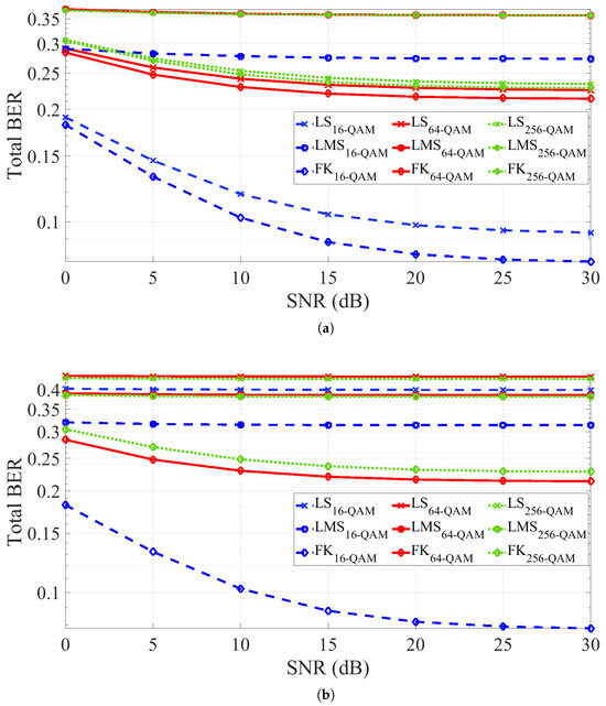 Figure 10b) configurations. The analysis covers three modulation schemes: 16-QAM, 64-QAM, and 256-QAM. Although the EVM compensation after SIC is comparable, the BER varies significantly with the modulation order. As expected, higher-order modulations yield higher BER, particularly at low SNR values.